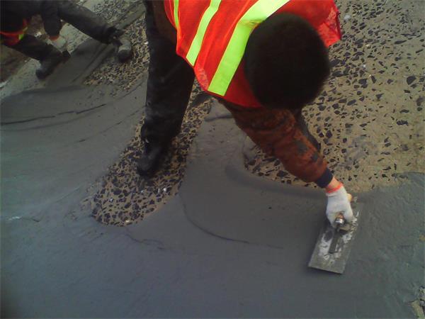 4.當所有準備工作都完成后,使用已經攪拌好的水泥路面修補料對露石子部位進行修復,用抹子刮平材料,收光,整個修補過程應該控制在30分鐘以內。